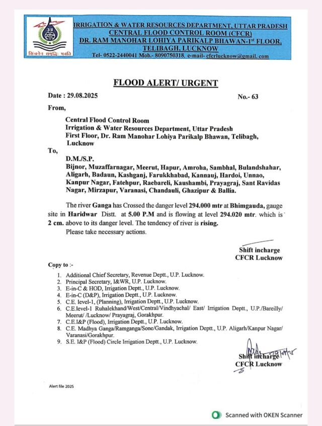 हरिद्वार स्थित भीम गौड़ा बैराज से शुक्रवार शाम लगभग 5 बजे करीब 2.30 लाख क्यूसेक पानी गंगा नदी में छोड़ा गया है विशेषज्ञों के मुताबिक इसका असर जल्द ही बिजनौर जिले के गंगा किनारे बसे गांवों तक पहुंच सकता है प्रशासन ने नदी तटवर्ती क्षेत्रों के निवासियों से अपील की है कि वे पूरी सतर्कता बरतें और अनावश्यक रूप से गंगा किनारे न जाएं पानी का स्तर बढ़ने की संभावना को देखते हुए लोगों को पहले से ही सुरक्षित स्थानों पर रहने की सलाह दी गई है