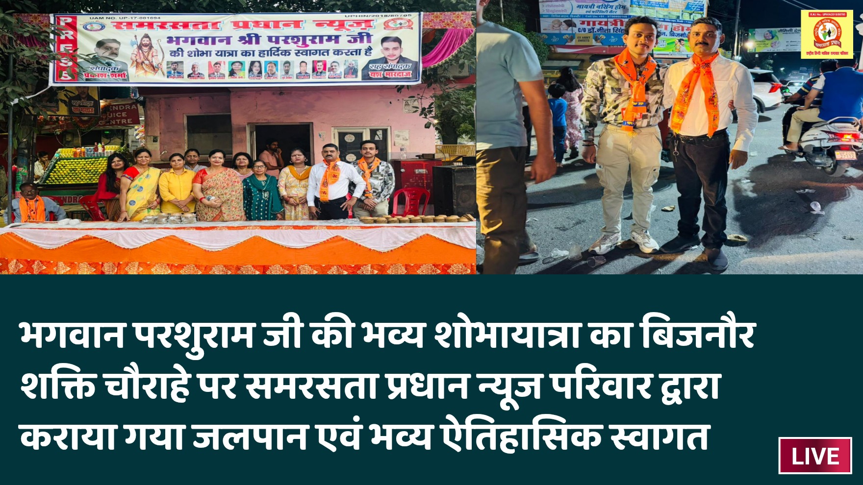 भगवान परशुराम जी की भव्य शोभायात्रा का बिजनौर शक्ति चौराहे पर समरसता प्रधान न्यूज परिवार द्वारा कराया गया जलपान एवं भव्य ऐतिहासिक स्वागत