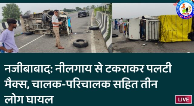 नजीबाबाद: नीलगाय से टकराकर पलटी मैक्स, चालक-परिचालक सहित तीन लोग घायल